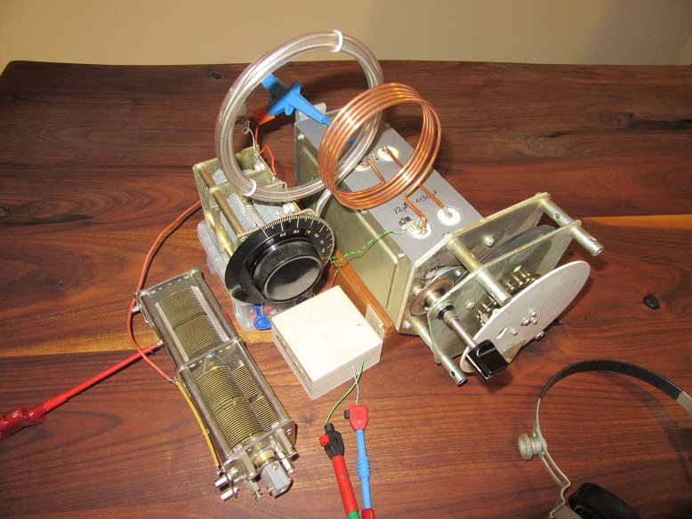 Die beiden Übertrager müssen isoliert auf dem Gehäuse liegen. Eine Verbindung des Kerns zum Drehkogehäuse verschlechtern extrem das Ergebnis in seiner Lautstärke. Das Gehäuse des versilberten Doppeldrehkos reagiert extrem auf Handkapazitäten. Es gibt auch eine kapazitive Wirkung des Gehäuses auf die Innereien. Wie groß diese Kapazität ist, muss ich noch überprüfen. Im Plan seht ihr die beste Lösung um die Erde zu kontaktieren. Es gibt also keine direkte Verbindung zum Schwingkreis. Die Erde wird nur kontaktiert um die Frequenzen < 10MHz zu erfassen. > 10MHz darf die Erde nicht angeschlossen werden. Die Resonanzkurve wird dann extrem breit und die Selektion sehr schlecht, Lautstärke gering. Nur mit Antenne, ohne Erdanschluss, lassen sich prima Frequenzen 10MHz bis 16MHz erfassen. Sehr beieindruckend, da gerade am Tage bis in die späten Nachmittagsstunden hier einiges los ist. Die Spule ist aus 5mm Kupferrohr gebogen und hat etwa 3,5 uH. Restkapazität etwa 20pF. Interessant auch die Ankopplung der Antenne am kalten Ende der Spule.
