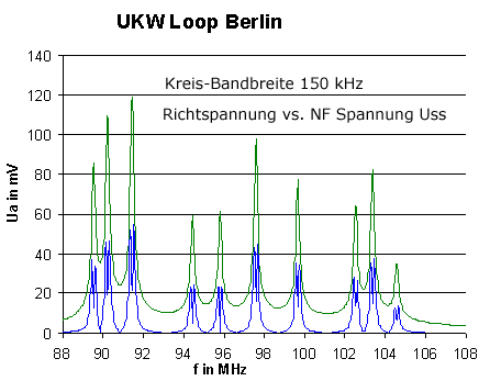 Die blaue Kurve zeigt jeweils die Spannungsdifferenz, die sich auf der Kurve bei +/- 75 kHz ergibt. Die Maxima stellen somit den besten Empfang bei größter Dynamik dar, als NF Spannung Spitze-Spitze auf der Flanke.