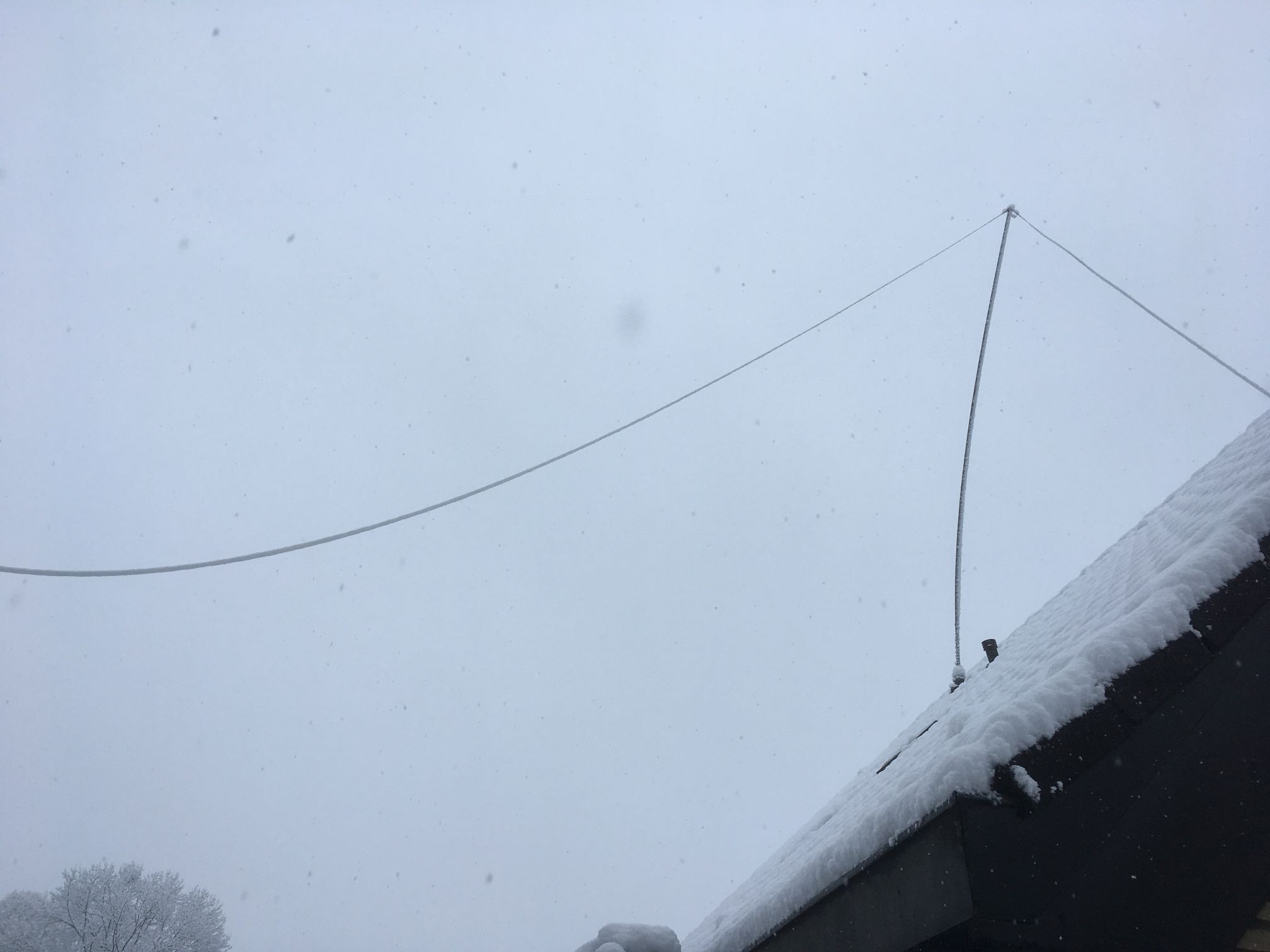 Eine Dachkapazität wird durch 6 Stk. 3m-Drähte gebildet, verlängert durch Maurerschnur ergibt sich eine wirksame Abspannung. (leider kann hier nur ein kurzer Draht von 15m gezogen werden).