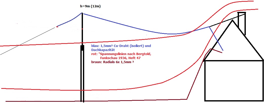 Hallo, Die bisherige 12m-Antenne war so eine Mischung aus Kreuz- und Korbantenne, hat gut empfangen- Nachteiltig war, dass sich die vielen Drähte der Dachkapazität beim Aufrichten in irgendwelchen nahen Asten verfingen. Dazu war die Antenne schlecht bei stürmischem Wetter aufzurichten, wegen der Windanfälligkeit.
