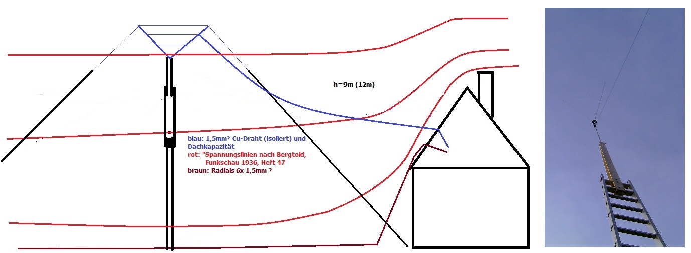 Das Bild zeigt den gestrigen Versuchsaufbau, RDL war selbst bei mäßigem "In Ear-Hörer" gut zu hören, im empfindlichen Hörer dann so richtig laut. Wenn jetzt noch Teile der Abspannung mit zur Dachkapazität hinzukommen, dann kann die Höhe sicherlich hier wieder auf 10m verringert werden. 12m Höhe lassen sich im "Leichtbau" noch recht gut "wuchten", das Hebelgesetz gilt aber auch beim Aufrichten eines Mastes, bei windigem Wetter ist das mitunter so eine Sache, bis die Leiter am vorbereiteten starken Holzpfahl sicher befestigt ist. Es gilt also, einmal ein große Kapazität zu erzielen und dabei wenig Angriffsfläche für den Wind zu geben. Massive senkrechte Blechplatte ist da eine ganz schlechte Idee. Nasse Holzbretter hochwuchten auch. Eine Beschreibung der Korbantenne und anderer, heute zunächst lustig erscheinender Antennenformen auf dieser Seite: http://edi.bplaced.net/?Edi%60s_Specials...gessenes_Wissen