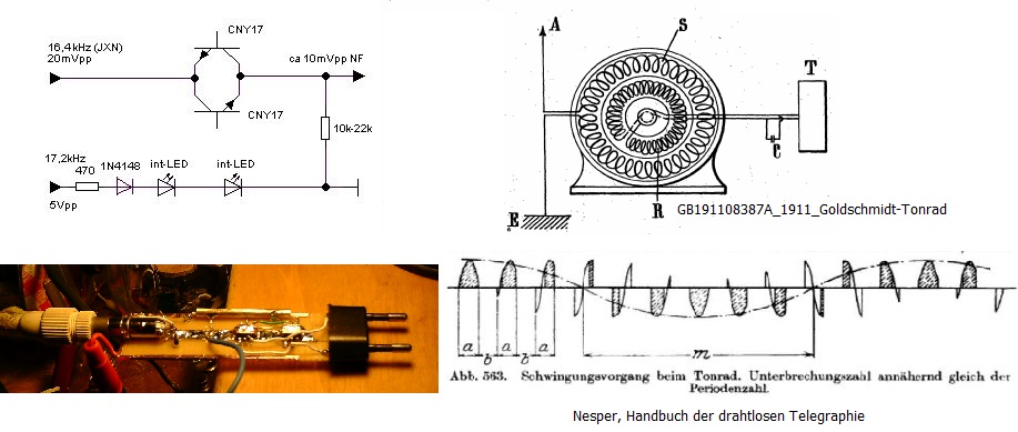 So konnte "JXN" Gedüdel auf 16,4 kHz mit einer Überlagerer-Frequenz von etwa 2,4 kHz praktisch genauso gehört werden wie mit höheren Überlagerer-Frequenzen. Simuliert man mit dem eingebauten Überlagerer (2SH27L) einen Sender, so treten gleichzeitig mehrere Überlagerungstöne auf, wenn das Signal anliegt. ---- Goldschmidt-Bericht über sein "Tonrad" "ETZ" vol35, 1914, s.93 https://archive.org/details/elektrotechn...up?view=theater