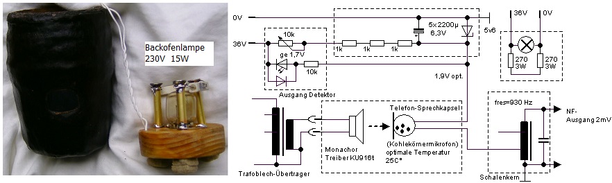Noch empfindlicher ist wurde die Sache mit einem luftdicht angeflanschten Telefon-Kohlemikro, die Sprechkapsel wurde aus einigen vorhandenen ausgesucht. Kein Knistern oder Lautstärke-Schwankungen, Trockenmittel direkt hinter der Kapsel und rückseitig beim Treiber. 2 Durch den resonanten Schalenkern-Übertrager erfolgt für den Röhren-Verstärker ihn eine Aufwärts-Transformation, gleichzeitig wird das Rauschen auf den Resonanzbereich begrenzt.