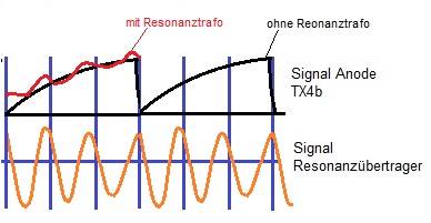 Der TX4b-Sägezahnschwingung ist die Resonanzkreis-Spannung überlagert und sorgt durch Triggerung für ein recht stabiles Signal, das bei Verstimmung auf die nächste Harmonische einrastet. Eine low-current-LED zeigt die optimale Einstellung an.