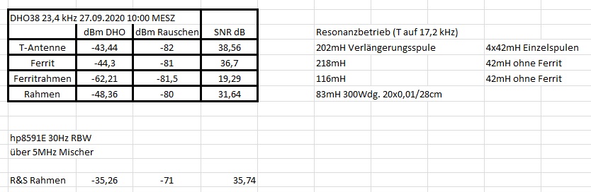 In meinem Spektrum vom 30.09.20/15:07:19 kann man den HWU mit gleichem Pegel wie DHO38 sehen. Ich habe mich schon über die Breite des Signals gewundert gehabt. Des Rätsels Lösung sind die beiden Resonanzfrequenzen, die zusammen mit der Antennen-Dachkapazität 423 pF (2x18,5m, Feeder 10m) auf 21473 Hz und 16697 Hz Resonanz ergeben, die näher an HWU als an DHO38 liegt. Wahrscheinlich könnte ich noch ein paar dB`s herausholen, wenn ich noch 10 Windungen abwickeln würde. (Nachtrag:waren 50 Windungen)