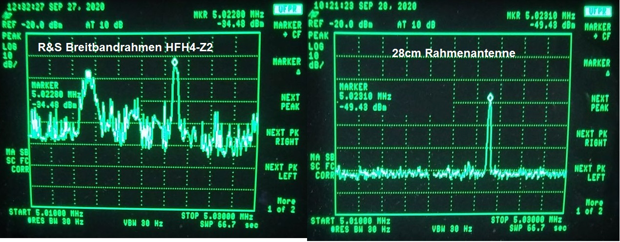 Nachtrag: Der Breitbandrahmen von R&S zieht sich über das Netzteil auf Längstwelle eine Menge Störungen rein, während sowohl der Sourcefolger der Ferritantenne als auch der 5MHz-Mischer aus einem 9V-Block versorgt ist. Leider geht der hp- Analyser nicht auf Frequenzen unter 100 kHz.