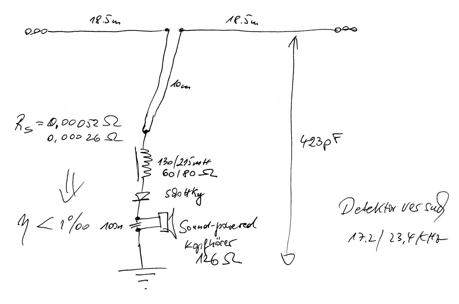 Heute morgen habe ich meine T-Antenne für einen Detektorversuch verwendet. Damit ist dieser Beitrag auch wieder im Fahrwasser des Themenerstellers (Rubrik Detektorempfänger). Was ich zu diesem Zeitpunkt nicht wusste: Der Marinesender Rhauderfehn war noch nicht in Betrieb. Ich konnte im Kopfhörer deutlich HWU Le Blanc aus Frankreich auf 21,75 kHz hören. Den Kopfhörer (mit 100nF gebrückt) habe ich von der Antenne über den Gleichrichter mit Erde verbunden. Am Ende des Ferriten für die Verlängerungs- spule ist eine 42mH Koppelspule aufgeschoben, in die der Überlagerungs- träger aus dem Messsender eingespeist wurde.