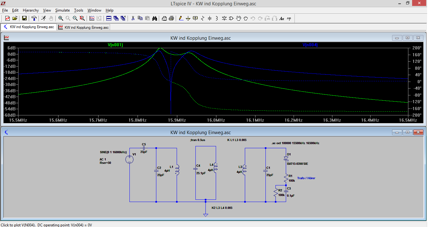 ja das funktioniert....es fehlt zwar noch die KW- Lupe am zweiten Filterkreis...aber der Drehko hat ein Getriebe und lässt sich schon relativ gut einstellen. Der Aufbau 10-16MHz. Antenne über 25pF direkt am Fußpunkt von L3. Die Resonanzen in Spice hier...