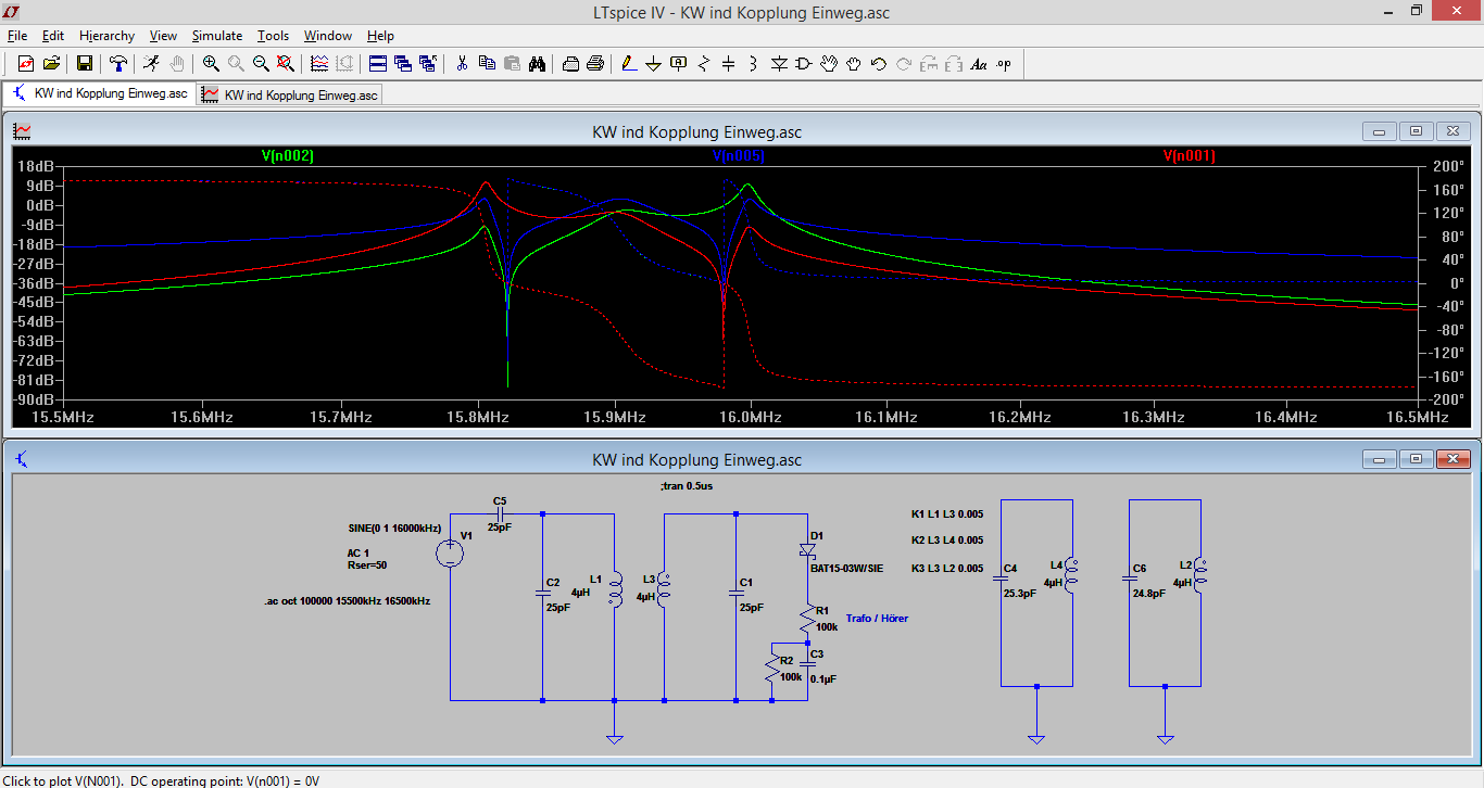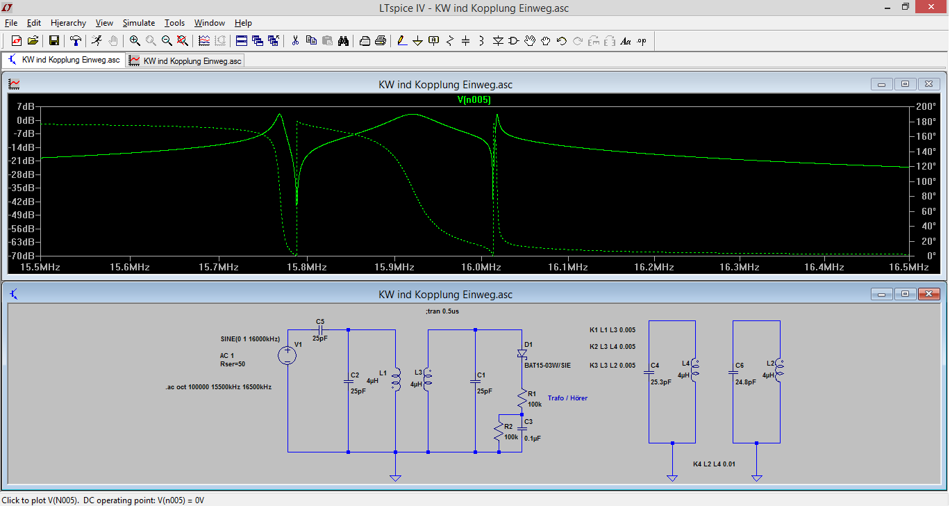 Hier mal eine Spicesimulation der Schaltung. Die dargestellte Einstellung sperrt ein starkes Signal im Detektorkreis. Sender links und rechts davon können gehört werden. blau = Detektorkreis / grün Sperr-Filterkreis. Jetzt will ich noch einen zweiten Filter dazu setzen und die Detektorkreisresonanz 1x von links und 1x von rechts beschneiden.