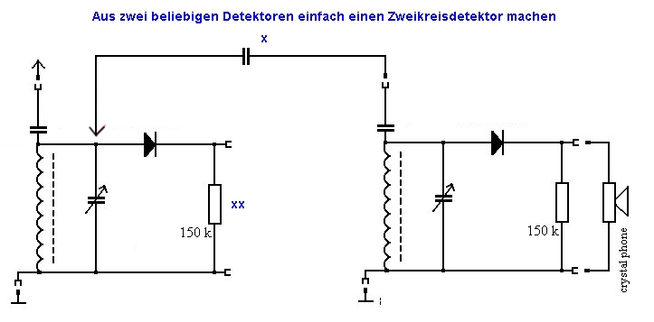 Ja Alfred, dass kann man natürlich auch machen. Rainers Langwellendetektor wäre hier eine gute Vorlage. http://www.welt-der-alten-radios.de/dete...2kreis-196.html Allerdings würde ich die Spulen dann für MW horizontal induktiv koppeln. ( Bei Zylinderspulen) . Die Dioden im Bauvorschlag Nr. 3 sind extrem hochohmig. Deswegen die Parallelanordnung ohne Anzapfung und mit Trafo. Das liegt am sehr hohen Resonanzwiderstand des LW- Schwingkreises. Der erste Detektor, der dann den Antennenkreis bildet, sollte eine trennbare Diodenstrecke haben, wenn ein Kristallhörer verwendet wird. Du hast so immer den Widerstand über die Diode am Schwingkreis. Diese Belastung ist aber eigenlich nicht gewollt. (Deine Skizze).