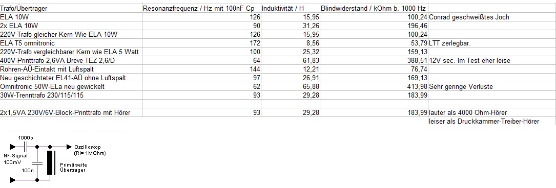 Je größer die Induktivität des jeweiligen Übertragers, desto größer auch im praktischen Aufbau die erhaltene NF-Spannung am Hörer. Einzige Ausnahme war ein 400V-Printtrafo, der auch in vorhergehenden Röhren-Versuchen nicht so gut