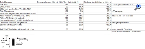 Wie man sieht, ist es unmöglich, bei kleinen Induktivitäten hochohmig anzupassen. Es fließt dann ein wesentlich größerer Querstrom durch den Trafo als man für den Hörer selbst nutzen kann. Die Spannung am Resonanzkreis bricht dann extrem ein, denn der ist ja ebenfalls hochohmig, wenn seine Güte hoch ist und die Antenne lose angekoppelt ist. - Wegen der doch recht guten Ergebnisse mit den beiden in Serie geschalteten Printtrafos wurde nochmals die Induktivität des 10W-ELA-Übertragers (Conrad 516104) über Resonanz gemessen. Das geht schnell, deshalb auch einige andere schon mal als Übertrager getestete Trafos wurden gemessen.