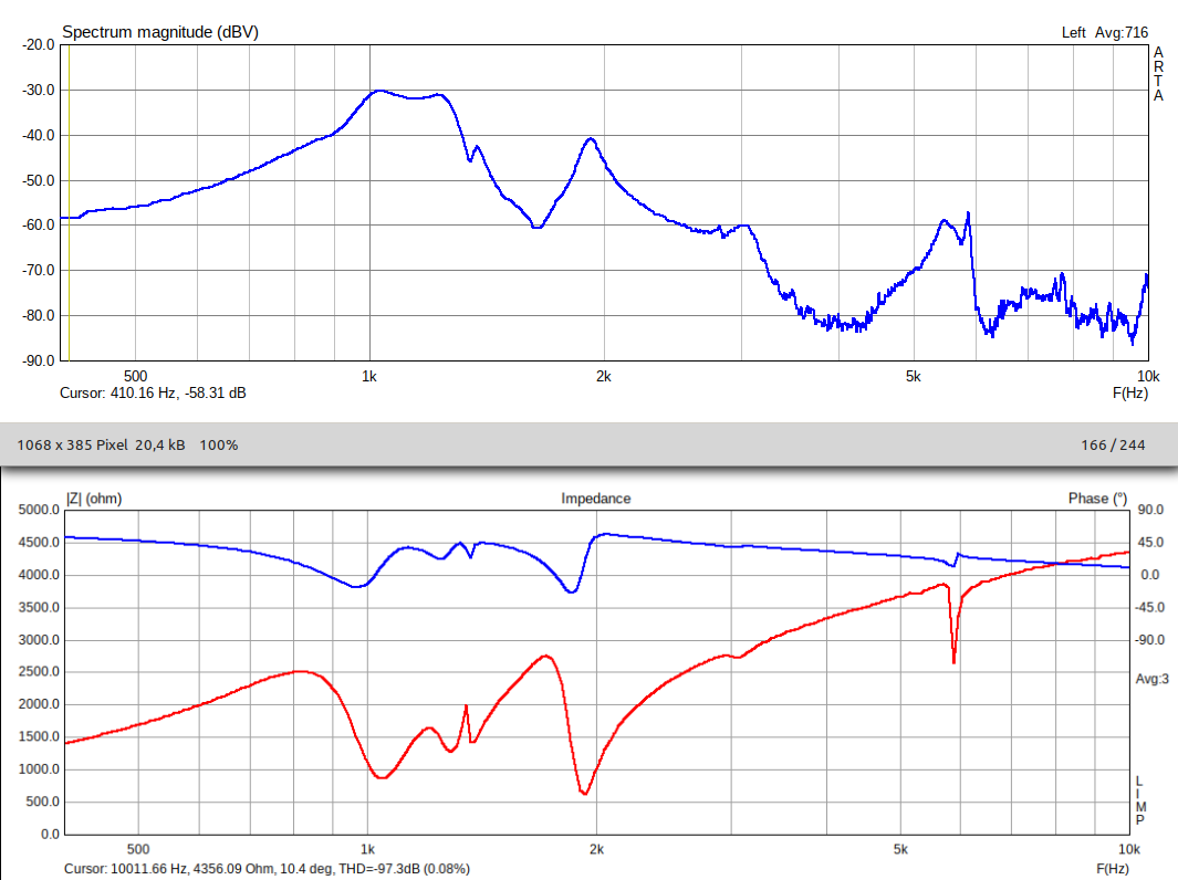 Zunächst zur Differenz der Impedanz der Western Electric (WE). Habe mit 820Ω, 1kΩ und 2,2kΩ Meßwiderstand getestet, das gerechnete Z bei 1kHz lag zwischen 1020- und 1029Ω, also im Bereich der Ableseungenauigkeit (ein AC Voltmeter ist analog). Bei dem Test lag der Hörer auf dem Tisch, setzt man ihn dabei auf die Ohren, steigt das Z, je nach dem wie dicht er aufliegt, bis über 1,5kΩ. Vielleicht ist das die Erklärung für die Differenz. Man bekommt auf diese Weise aber kein eindeutiges Ergebnis, eine kleine Bewegung und der Betrag steigt oder sinkt.