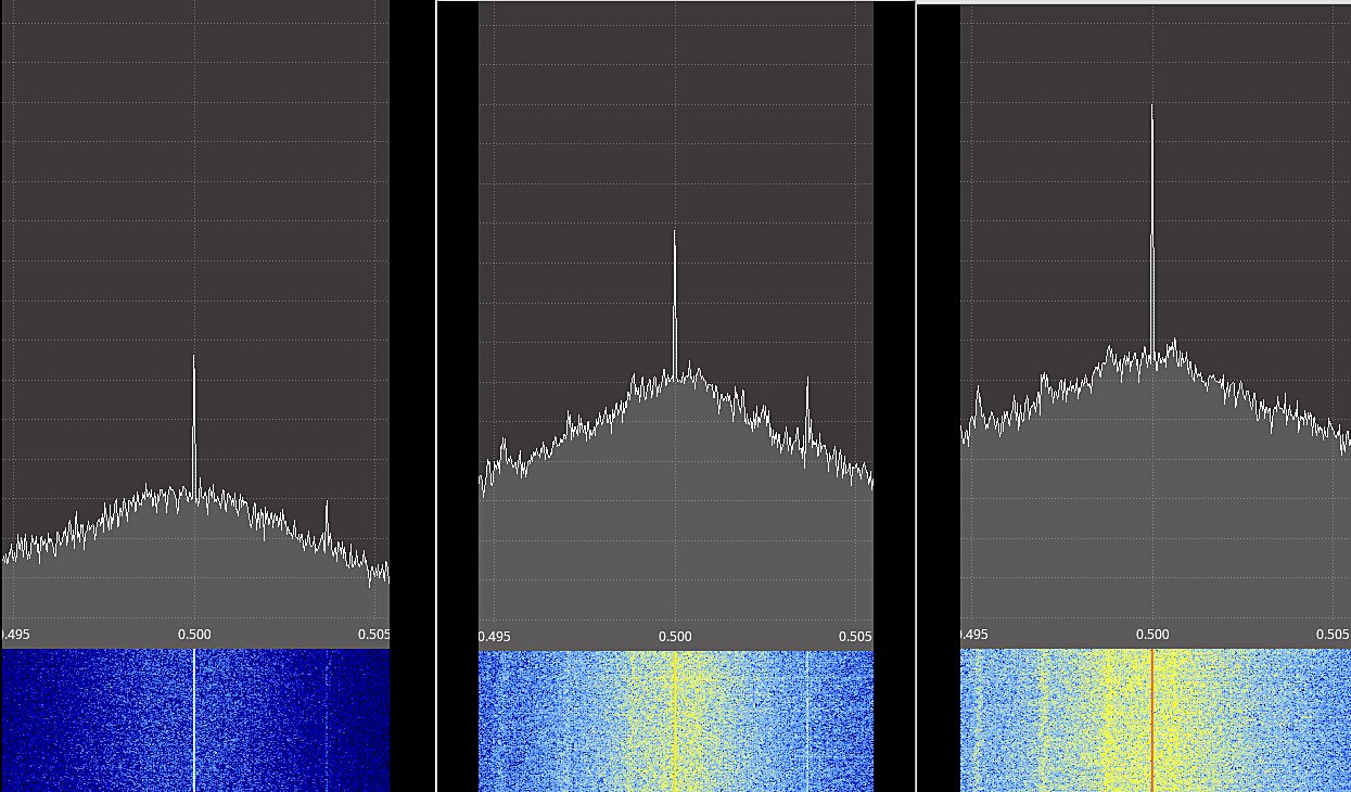 Die vertikale Teilung beträgt 5dB, links die kleine Ferritantenne 10 x 160, Mitte die große Ferritantenne und rechts ein kleiner Rahmen (10Wdg, 30cm Durchmesser.). Die Induktivitäten sind in etwa gleich, der Rahmen hat ungefähr den gleichen Durchmesser, wie die große Ferritantenne lang ist. Das SNR der beiden Ferritantennen ist fast gleich, mit sehr geringem Vorteil für den größeren Ferrit, der Rahmen ist erheblich besser.