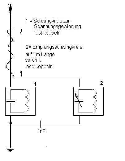 Hallo Joe, das kann man so machen. Entsteht doch durch Deinen 1 nF (an der Masseseite des Kreises 2) und der losen Umschlingung der Antenne des Gesamtgebildes mit dem Koppeldraht eine recht geringe Gesamtkoppelkapazität (vielleicht um 25-75 pF) am Stromversorgungskreis. Trotzdem nimmt der Empfangskreis (am wenigsten auf seiner Empfangsfrequenz) doch ein wenig Energie weg. Man könnte das Gleiche erreichen, wenn man schwach induktiv koppeln würde.