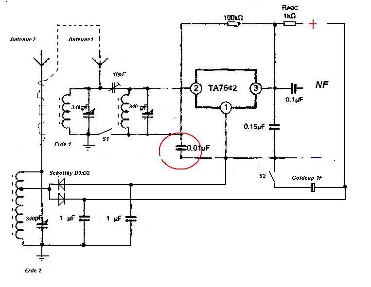 hier mal mein Prinzipschaltbild. Ich habe den Kondensator nicht selbst erfunden, der stammt aus der Applikation des TA 7642. Allerdings ist mir ein kl. Fehler unterlaufen, die direkte Masse der HF- Spannungsgewinnung ist noch über 1uF der Spannungsverdopplung gegen Masse getrennt und er hat nicht 1nF sondern 10nF !