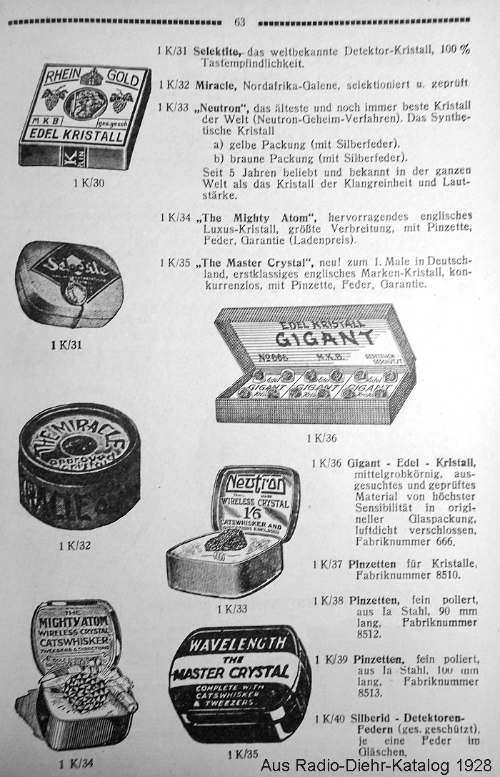 Im Radio-Diehr-Katalog von 1928 sind ca 25 Kristalle im Angebot. Viele davon werden natürlich als das Beste überhaupt angeboten.