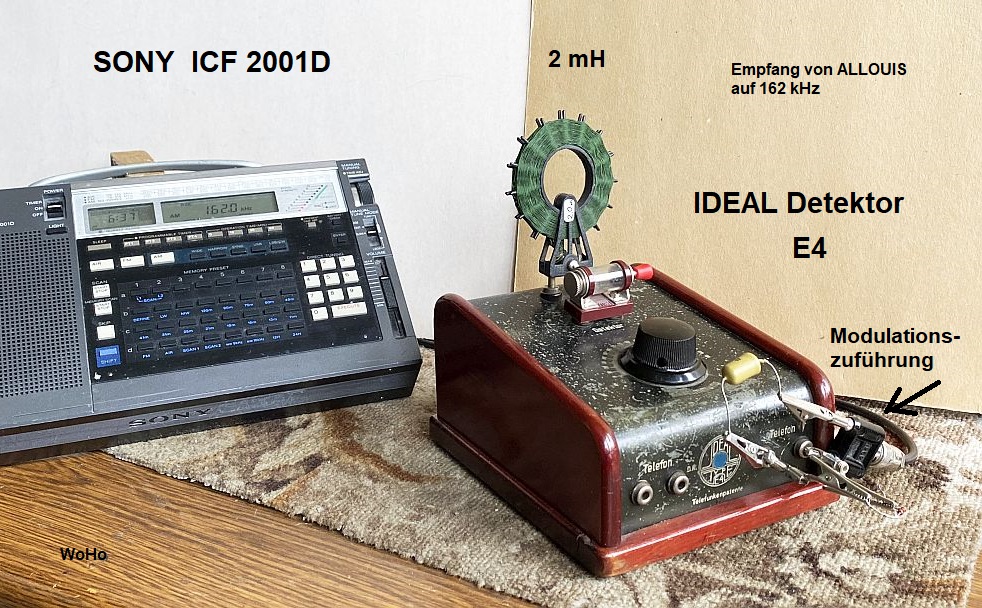 Dazu wurde der starke LW-Sender 162 kHz aus Frankreich mit dem Detektor empfangen. Der Träger ist nicht amplituden moduliert, also man hört nichts. Daneben wurde ein moderner, zweiter Empfänger (ICF2001D) auf die gleiche Frequenz eingestellt, jedoch ist dessen ZF-Verstärkung stark zurückgeregelt, sodass ohne den Detektor kein Empfang möglich ist.