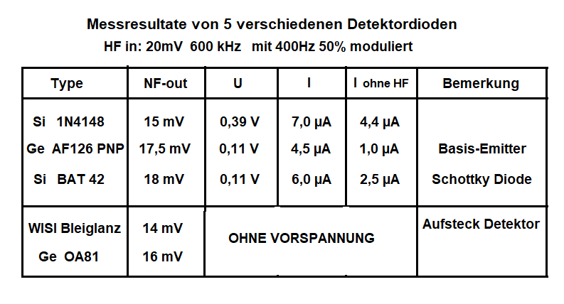 Obenstehende Tabelle zeigt uns die gewonnene NF am Kopfhörer. Die ersten drei benötigen eine gewisse Vorspannung um den besten Arbeitspunkt für die Gleichrichtung zu bekommen.
