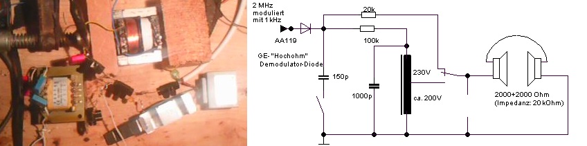 Mit diesem Trafo wurden wieder die vorhandenen Dioden mittels moduliertem Signal-Generator getestet, mit ähnlichem Ergebnis. Jedoch war die erforderliche Vorspannung geringer: SD101C : 165 mV (Anstelle von 240mV beim 4kOhm-Hörer mit 20 kOhm Impedanz) AA119 : 65 mV (Wieder geringfügig unempfindlicher als SD101C)