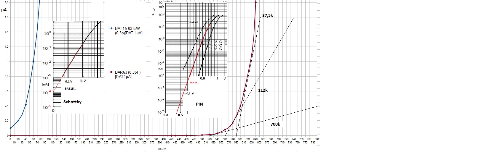 Um zu sehen, wo in diesem Fall die Diode arbeitet, die Kennlinien über die angegebenen 1µA hinausgeführt und nochmal gezeichnet: Möglicherweise haben "PIN-Dioden" wegen kleineren Rückstromes hier einen Vorteil gegenüber Schottk-Dioden. Versuch macht kluch, darum welche bestellt.
