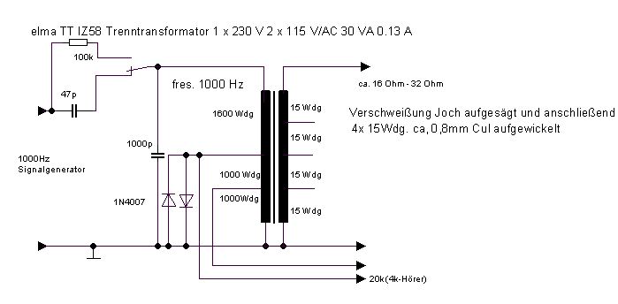 Um die besser an verschiedene Hörer, insbesondere niederohmige 16 Ohm-Hörer anpassen zu können, einen 30VA-Trenntrafo als Impedanzwandler mißbraucht, mit erstaunlich gutem Ergebnis. Die Wickeldaten sind bekannt: Etwa 3600 Wdg. gesamt. https://asset.conrad.com/media10/add/160...30-va-013-a.pdf
