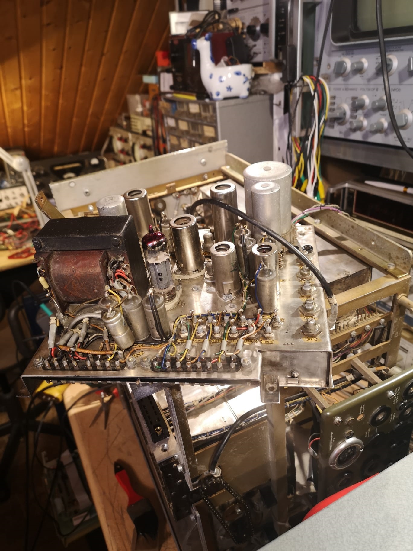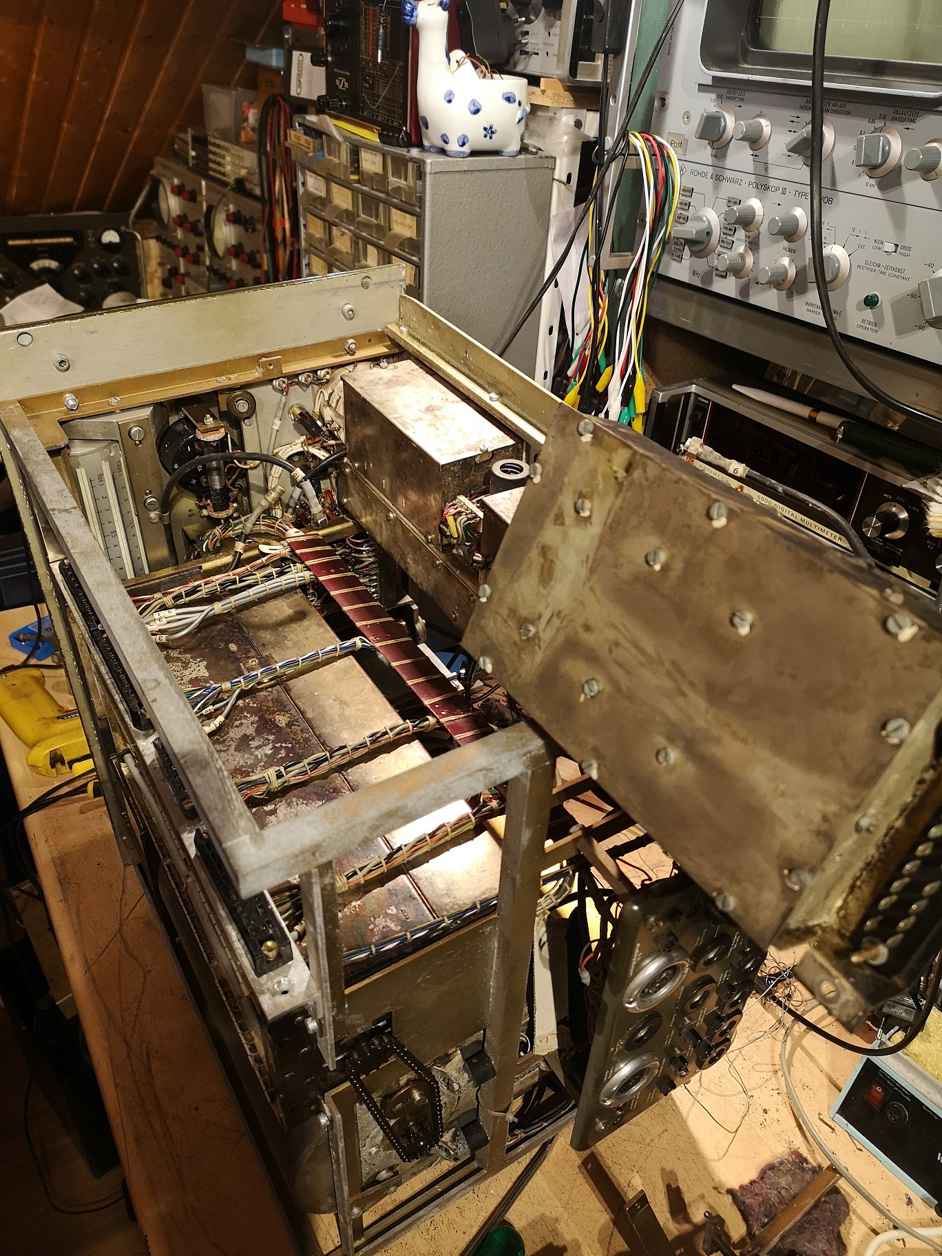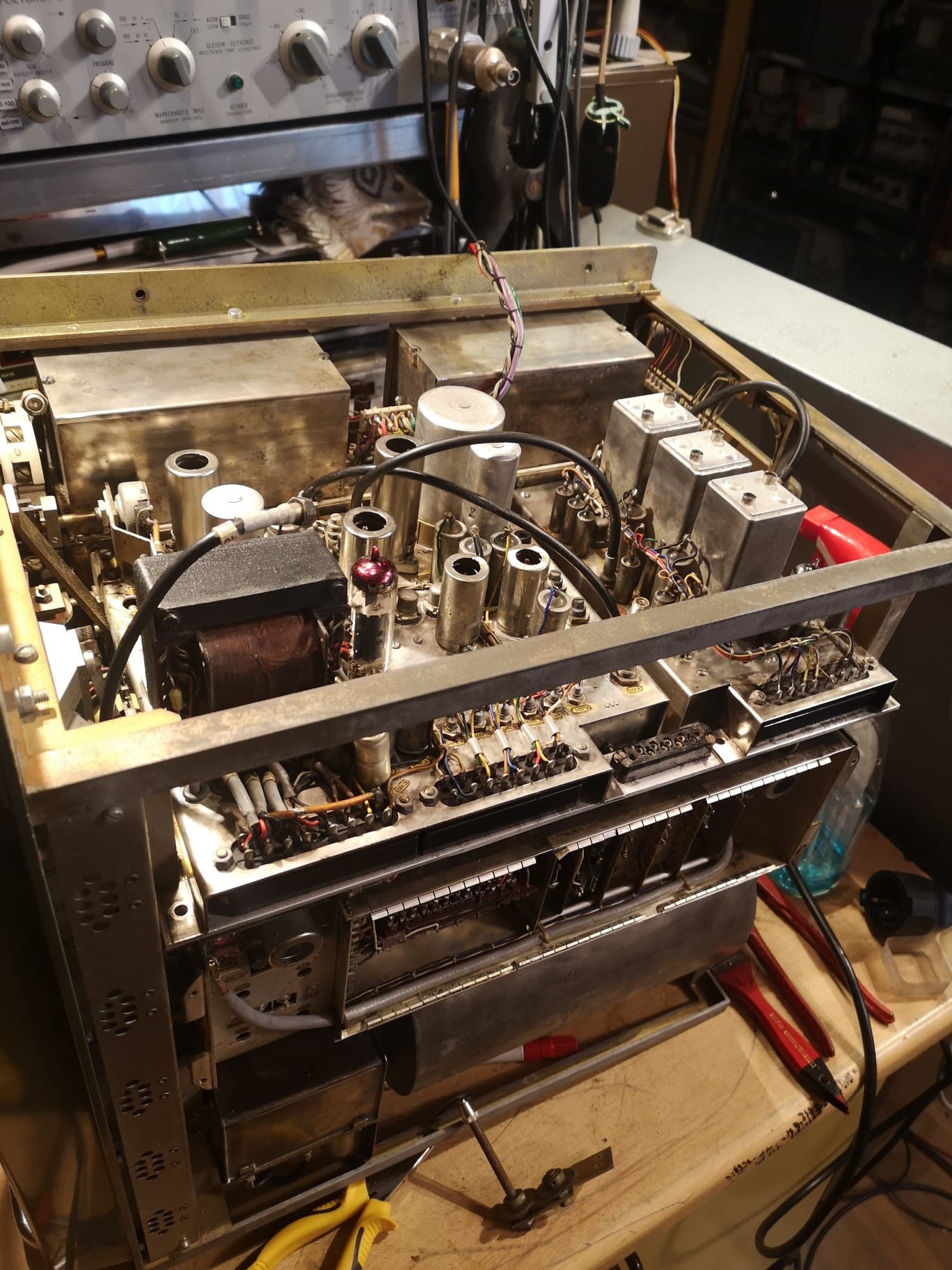 ja, so macht das Basteln deutlich mehr Spass. Dass so ein Brocken nicht in drei Tagen fertigwird ist völlig normal. Ich hab die Geduld mich um alles zu kümmern. Jetzt kommt die leidige Sache mit den Kondensatoren. Die sind einfach überall. Das Radio hat alle Röhren Topform, geprüft mit dem Neuberger. Elkos wurden teilweise erneuert. Es bleiben noch: Wickelkondensatoren, genau da siehts nicht so dolle aus momentan :-)