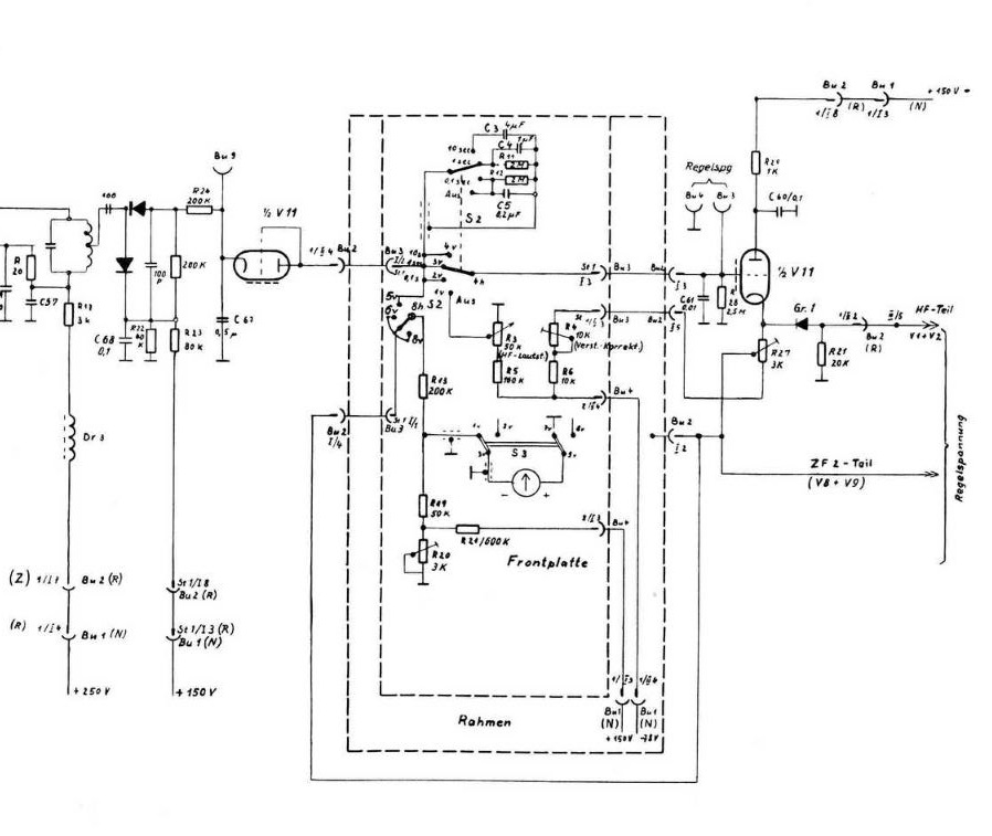 Der Ausgang Regelspannung (Buchse an der Geräterückseite) findet sich hier am Gitter des zweiten Systems der Röhre V11. Bis dahin sollte also alles in Ordnung sein, kam ja mehr als genug an. Hinter diesem Triodensystem gehen die beiden Regelspannungen weg für Empfangsteil (ZF1) und die ZF2. Also hab ich die Röhre einfach mal gewechselt und schon war er bei bester Laune, Ton nun klar und sauber, Regelspannungen am Ausgang gehen kaum tiefer als -9V