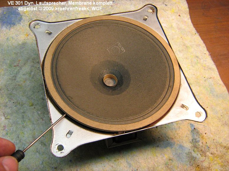 Bild 1: das "Opfer" Nummer 1. Ein Lautsprecher aus einem VE301dyn GW. Der gesamte Membranrand hat sich vom Korb gelöst, die Schwingspule schabt im Magnetspalt weil nicht mehr zentriert. Glückes Geschick: Die Zentrierspinne ist bei diesem LS-Typ nicht verklebt, sondern verschraubt. Das erleichtert die Reparatur ungemein.