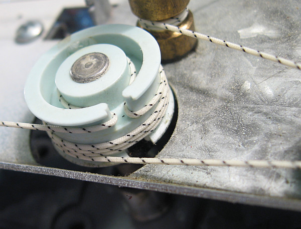 Bei einem Luxor Tapto war das Skalenseil für LMK gerissen. Zum Glück konnte die Skalenseilführung mit Hilfe der Überreste und etwas Überlegen ermittelt werden. Alle Achsen gingen leichtgängig. Als Skalenseil nahm ich zuerst Maurerschnur, weil ich damit bereits sehr gute Erfahrung gemacht hatte und weil es unschlagbar billig ist. Trotz hoher Federspannung an der Zugfeder rutschte das Skalenseil an der Messingachse des Drehknopfes durch.