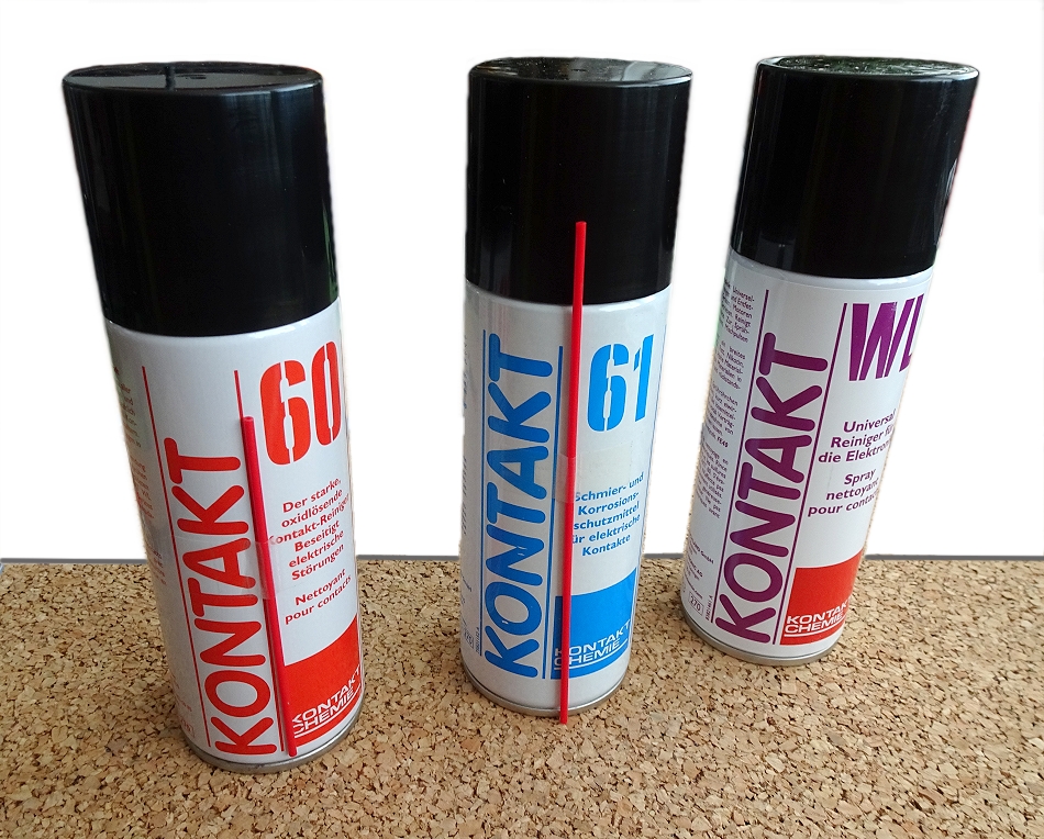 wiedermal brachte der Liefer-Service ein Gebinde von Kontakt Chemie. Dabei erschien vor meinem geistigen Auge mein erster Arbeitstag als frischer Lehrling (Rundfunk- und Fernsehtechniker) im Jahr 1964 (ja, das war im vorigen Jahrhundert). Gleich bei meiner ersten Radio-Reparatur kam Kontakt 60 zum Einsatz. Später kam der Umgang mit Kontakt WL und Kontakt 61 hinzu. Was soll ich sagen, die Nutzung dieser Spray-Familie dauert bei mir bis heute an.