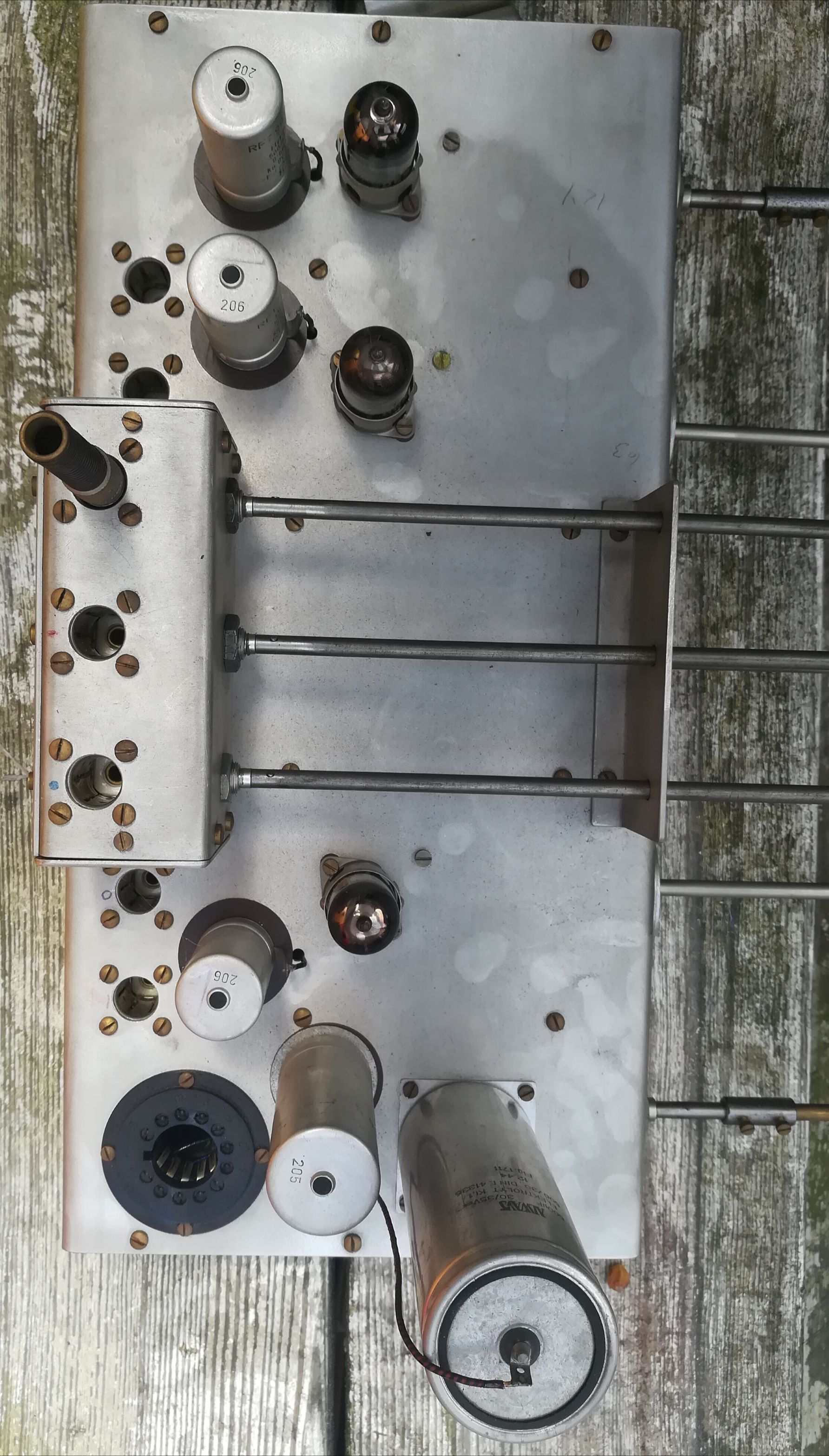 Am Aufbau interessant ist noch, dass 2 mal Bohrungen für zentrisch mit großer Mutter zu befetigende Elektrolytkondensatoren gebohrt wurden und dann andere von Siemens von 1944(!) eingebaut wurden Wert 500µF 30/35Volt.