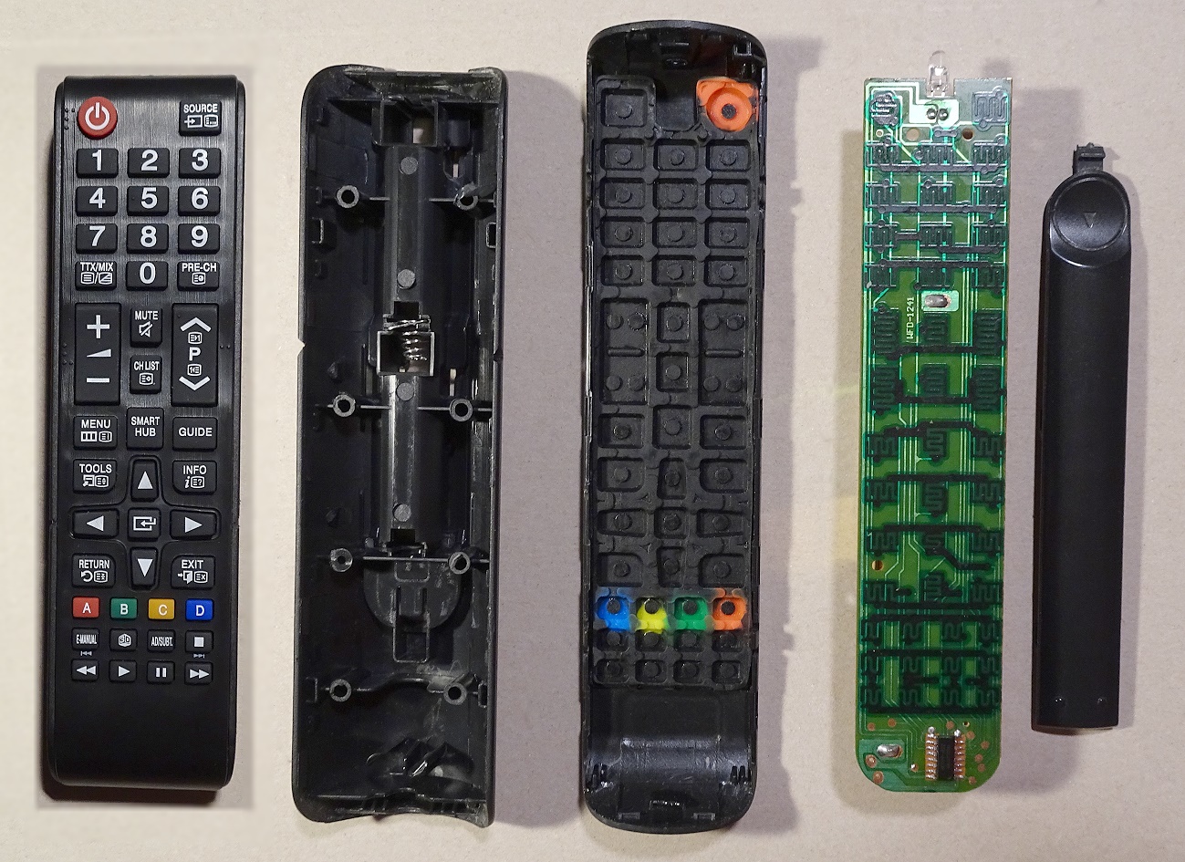 Zuerst dachte ich: Na, ist Dir da irgendwann etwas in die Fernbedienung eingelaufen. Aber nach Überlegen konnte ich das ausschließen. Eine externe Flüssigkeit kann ohne Tauchbad dort nicht hinkommen.