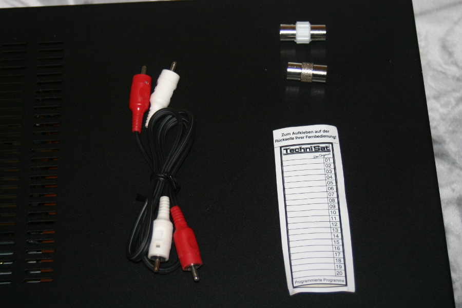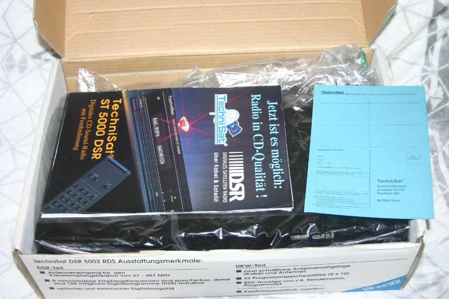 Der Käufer fand wie zu erwarten eine Garantiekarte von Technisat, eine Bedienungsanleitung und eine Werbebroschüre zu DSR. Zu Letzerem kommen wir später noch. In der 2. Schicht erwartet uns das noch in Folie eingepackte und mit Schutzfolie versehende Empfangsgerät.