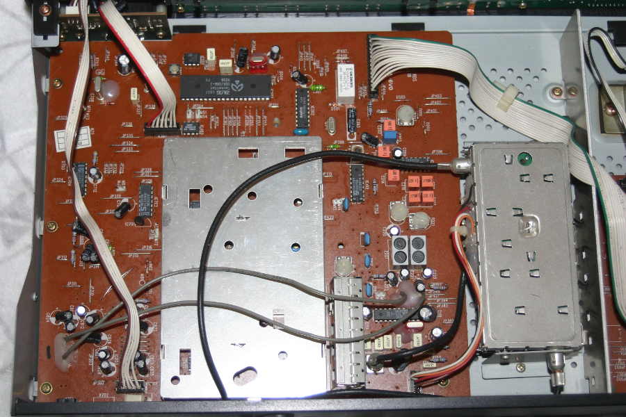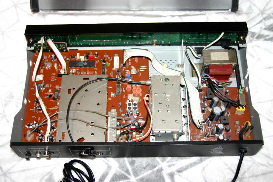 Kein Gramm Staub und ein Anblick eines Aufbaus, den wir in heutigen Geräten technologiebedingt nicht mehr oft zu sehen bekommen. Rechts das Netzteil zur Erzeugung verschiedener Spannungen, ebenso eine Netztrennung mit "richtigem" Schalter. Mittig neben der Hauptplatine der digitale Empfangsteil, auf der Hauptplatine der UKW-Tuner, sowie UKW und DSR-Dekoder von Technisat (DDR-ASIC!!!), ansonsten Speicher und Halbleiter aus aller Welt. Auf der grünen Platine das Bedienteil mit Frontprozessor.