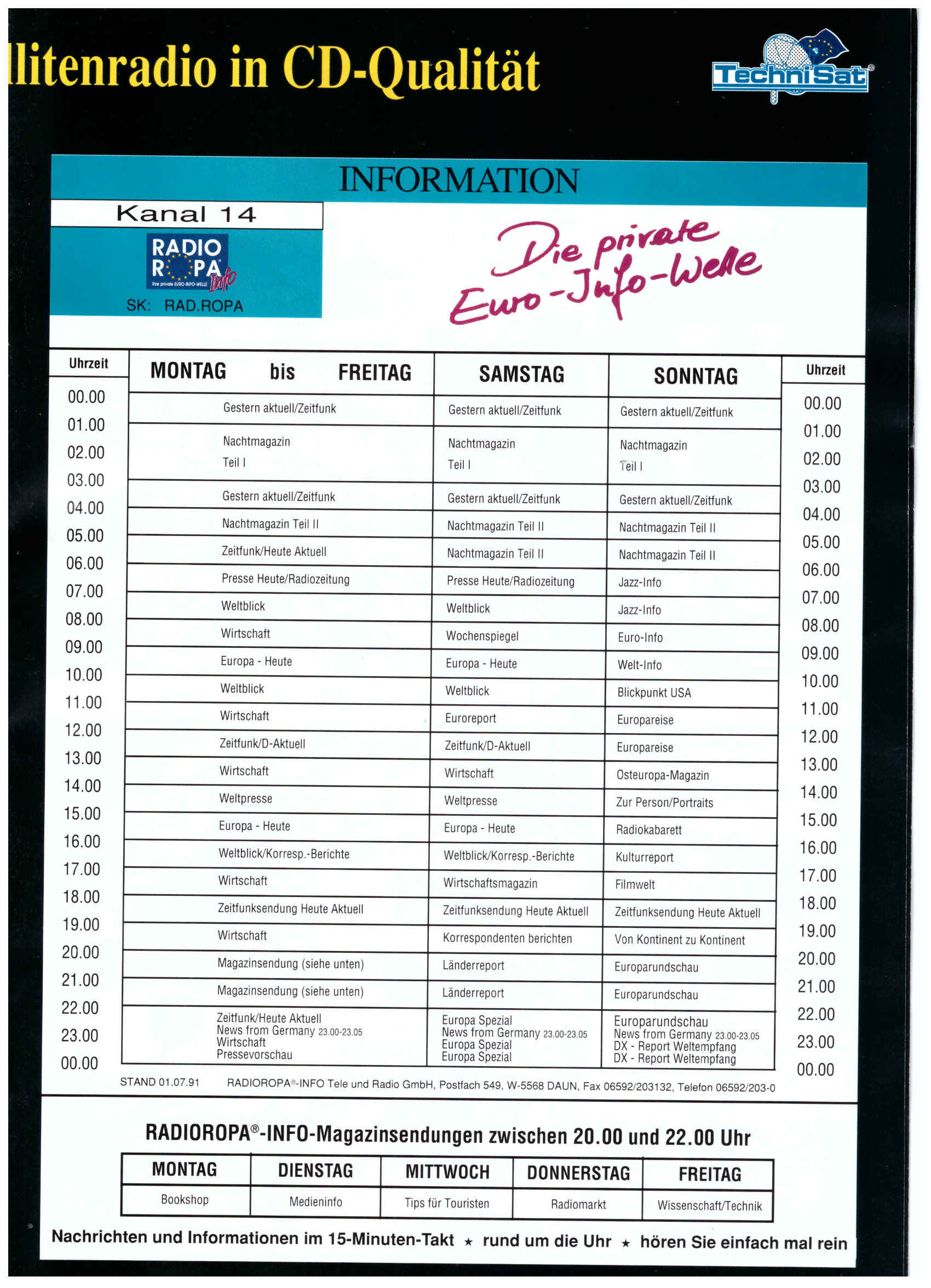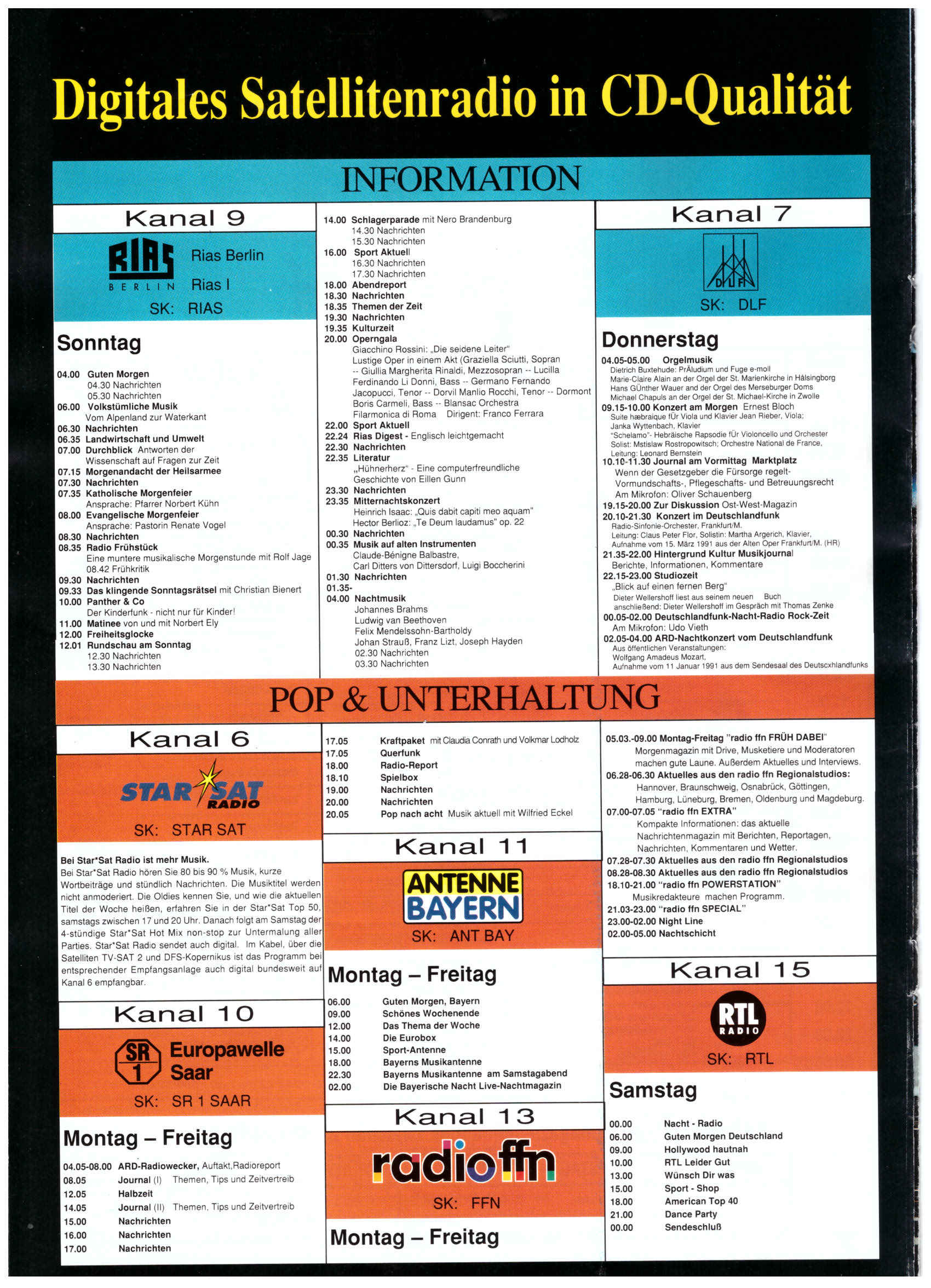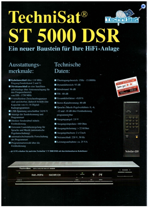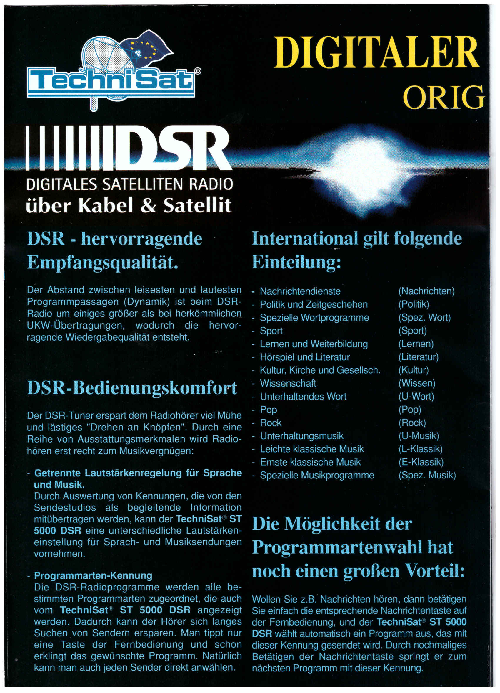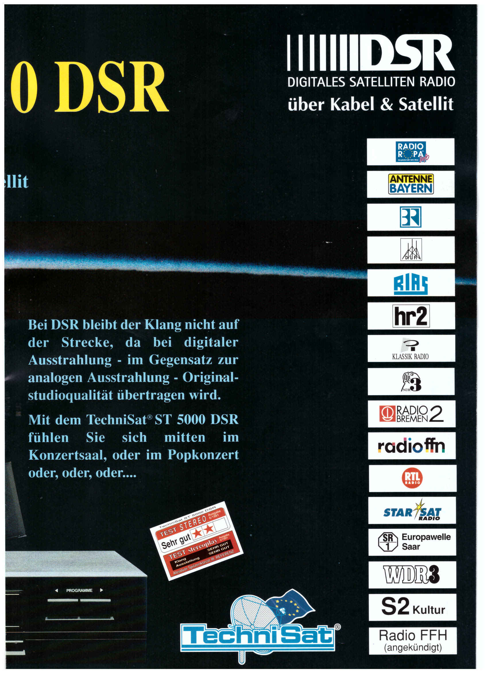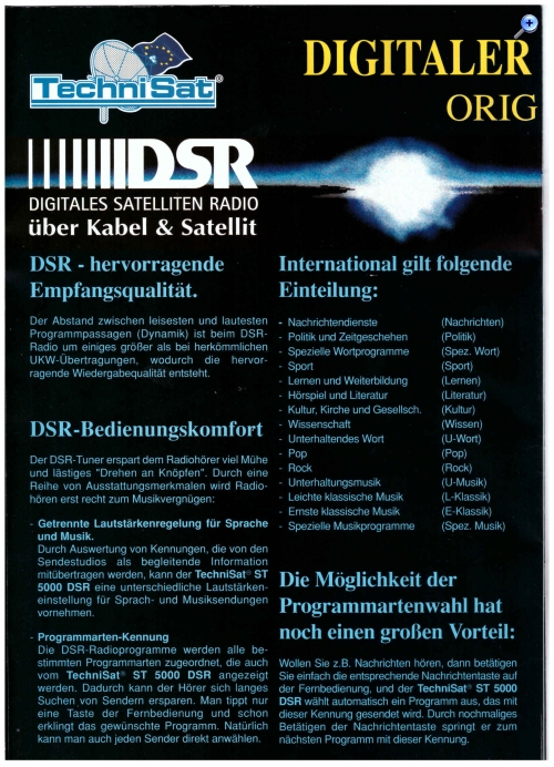 Ich war damals beim Start des DSR-Systems ebenfalls dabei und hatte den DSR-Empfang mit einer 30-40cm großen Antenne auf TV-Sat2 (19 Grad West), später über DFS Kopernikus realisiert. Das DSR-Signal wurde von der Post/Telekom auch in Kabelnetze auf 118 MHz eingespeißt. Auf diesem Kanal wurden dann 16 Stereo-Radioprogramme übertragen. Als ich in den letzten Tagen und Wochen Material zu DSR gesucht habe, stieß ich auf die Seite des Deutschen Museum Bonn und war etwas überrascht, das das DSR-Radio selbst in der DDR eine Bedeutung hatte!