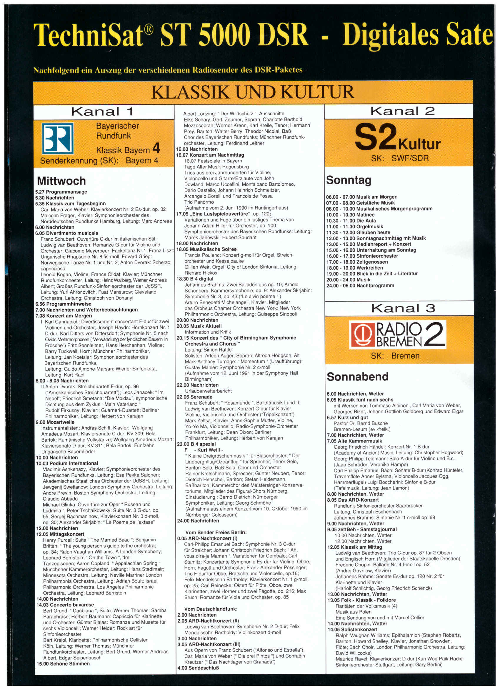 Wie man sieht handelt es sich um ein Kombigerät für DSR und UKW mit RDS. Es ist die "Kabelvariante", besitzt auf der Rückseite also kein Sat-ZF Eingang. Bemerkenswert ist, das das Gerät nicht nur für die 118 MHz ausgelegt ist (solche Geräte gab es), sondern einen größeren Frequenzbereich nach DSR-Signalen durchsuchen kann. Technisch wären 8-Kanäle mit insgesamt 128 Hörfunkprogrammen möglich gewesen, aber so einen Ausbau hat DSR in Deutschland nie erreicht! Hierzulande blieb es bei 1-Kanal mit 16 Hörfunkprogrammen. In der Schweiz waren wohl in einigen Kabelnetzen 2-Kanäle mit insgesamt 32 Programmen on Air, eventuell finde ich die schweizer Programmbelegung noch irgendwo. Dort hieß das System DigitSuperRadio.
