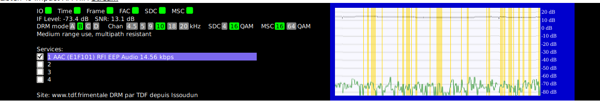 Heute morgen ist es mir gelungen, damit mal Radio France auf 3965kHz zu dekodieren, das war aber instabil, immer wieder Abbrüche bei schwächerem Signal (sieht man ja auch am Verlauf).