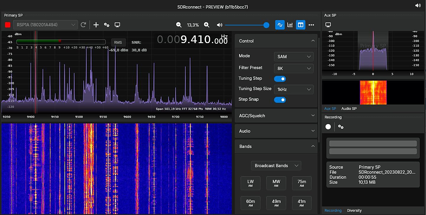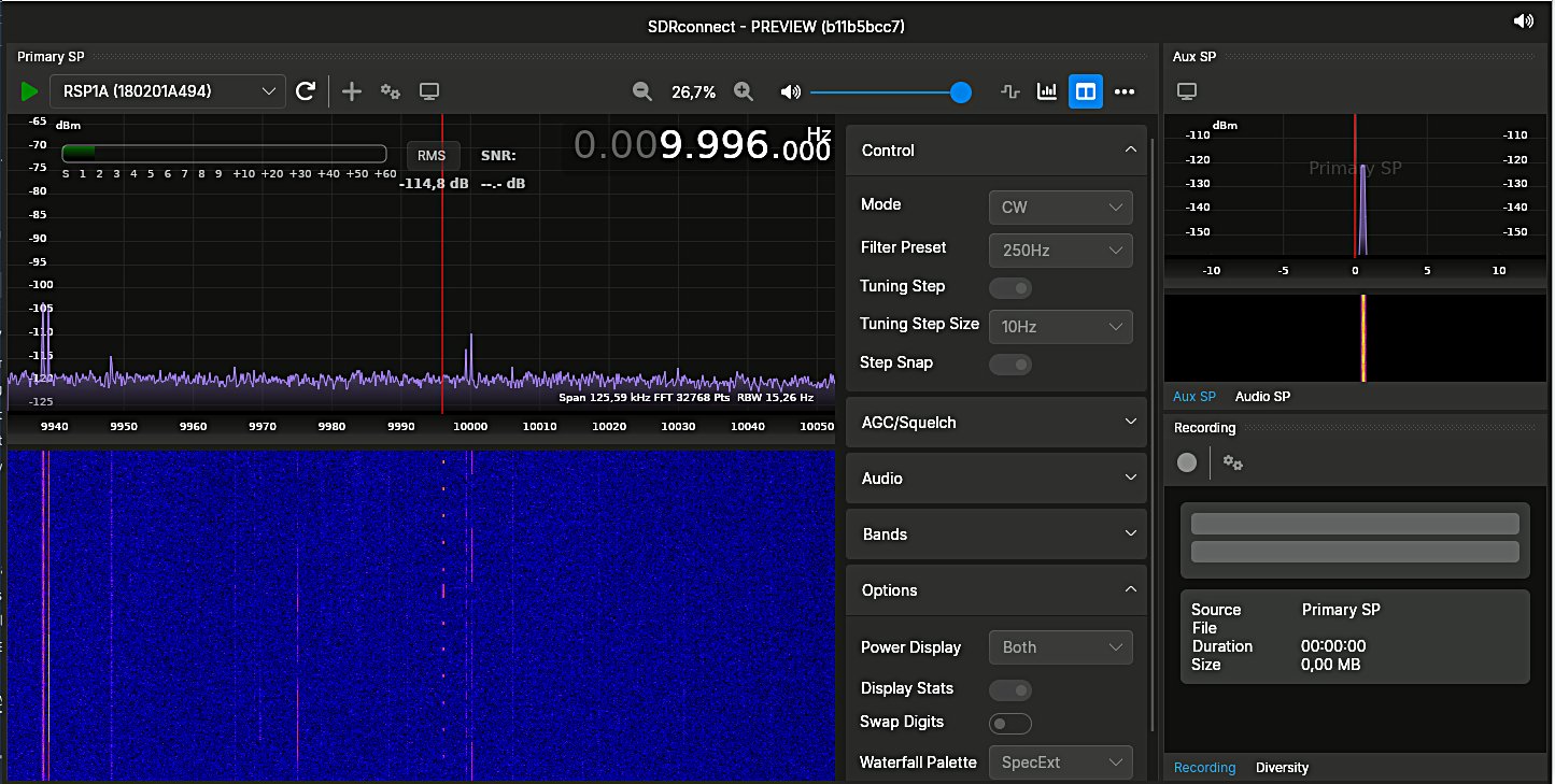Seit Kurzem steht von SDRplay eine neue Software als Preview zur Verfügung - siehe hier Laut Angabe sollen alle SDRplay Empfänger, außer dem RSP1 unterstützt werden. Bei mir läuft der RSP1A tadellos damit. Für mich insofern ein Zugewinn, als dieser RX nun endlich unter Linux benutzbar ist, was mich sehr freut. Das Beispiel RWM Moskau von gerade eben indoor an der 80cm Loop. Bin gespannt auf die erste Finalversion.