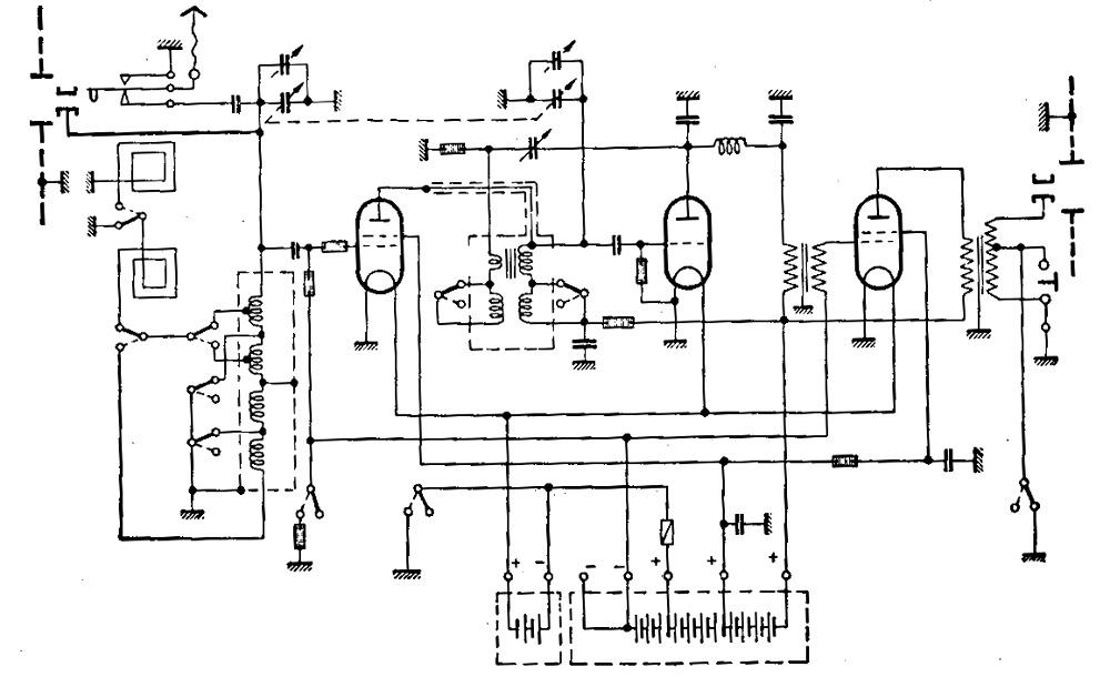 für mich ist das ein 2-Band - Zweikreiser in Audionschaltung mit Rückkopplung und HF-Vorstufe und NF-Stufe ohne Neutralsierung und mit Antennen/Rahmenantennen-Anschluß. Im Schaltbild scheint mir ein Fehler zu sein, denn durch die Rückkopplungsspule kann kein Strom fließen nach Masse!