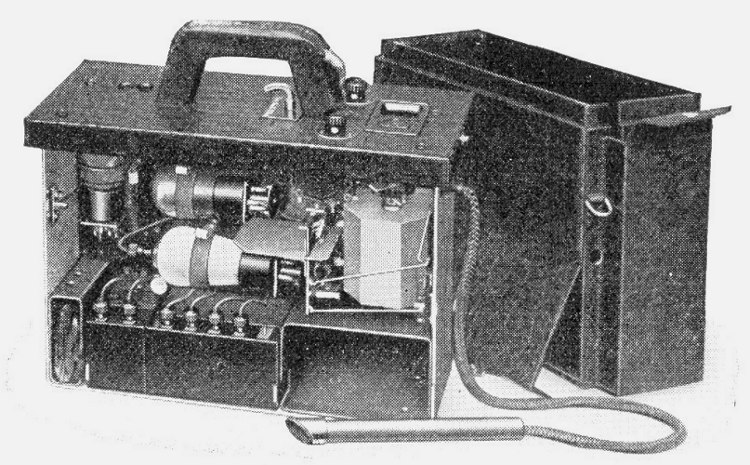 Klaus war am nächsten dran. Es ist ein "Störsuchgerät" von ca. 1933. Der Wellenbereich ist von 200 - 2000m = 150kHz - 1500kHz. Es diente zur Aufspürung von Rundfunkstörungen die aus den damaligen Quellen stammten. Das Rohr an der Messleitung war wohl die Antenne zum aufspüren von ganz nahen Störern, es konnten aber auch Rahmen.-u. Langdrahtantennen verwendet werden. Das Schaltbild war als Prinzipschaltung bezeichnet. Heutzutage würde das Gerät gar nicht mehr zur Ruhe kommen.