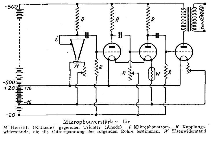 Da wir alle so schön Raten, mal was leichtes. Hier das Prinzipschaltbild eines sehr frühen Mikrofonverstärkers so um 1924. Das Mikrofon hat einen besonderen Namen und arbeitet im Grundprinzip wie ein Kohlemikrofon mit Widerstandsänderung, aber auch wie eine Oxydkatode.