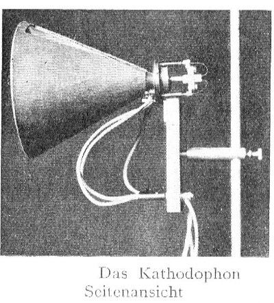 Genau! Ein Kathodophon. Die Arbeitsweise ist sehr ungewöhnlich meine ich, jedenfalls für heutige Ansprüche. Eine Art Glühkatode mit einer Oxydschicht in Stiftform bildet die geheizte Katode und ein Sieb als Anode das vom Schalltrichter bewegt wird bewirken die elektrische Umwandlung der Schallschwingung. Das ganze findet an der Luft statt, so das die Stromänderung einer Ionisierten Wegstrecke die ja der Schallschwingung folgt, als Signal für die anschließende Verstärkung dient. Ein leider nicht sehr gutes Foto zeigt zumindest die Bauweise.