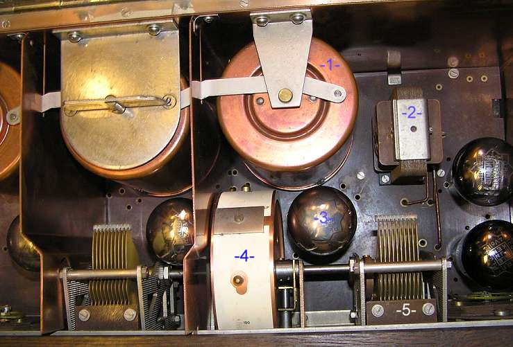 1. Hierunter dürfte sich eine der Schwingkreisspulen verbergen 2. Zwischenübertrager zwischen Vor- und NF-Endstufe 3. Röhre (aufgrund der Position vermutlich die Audionröhre 4. Skala 5. Drehkondensator