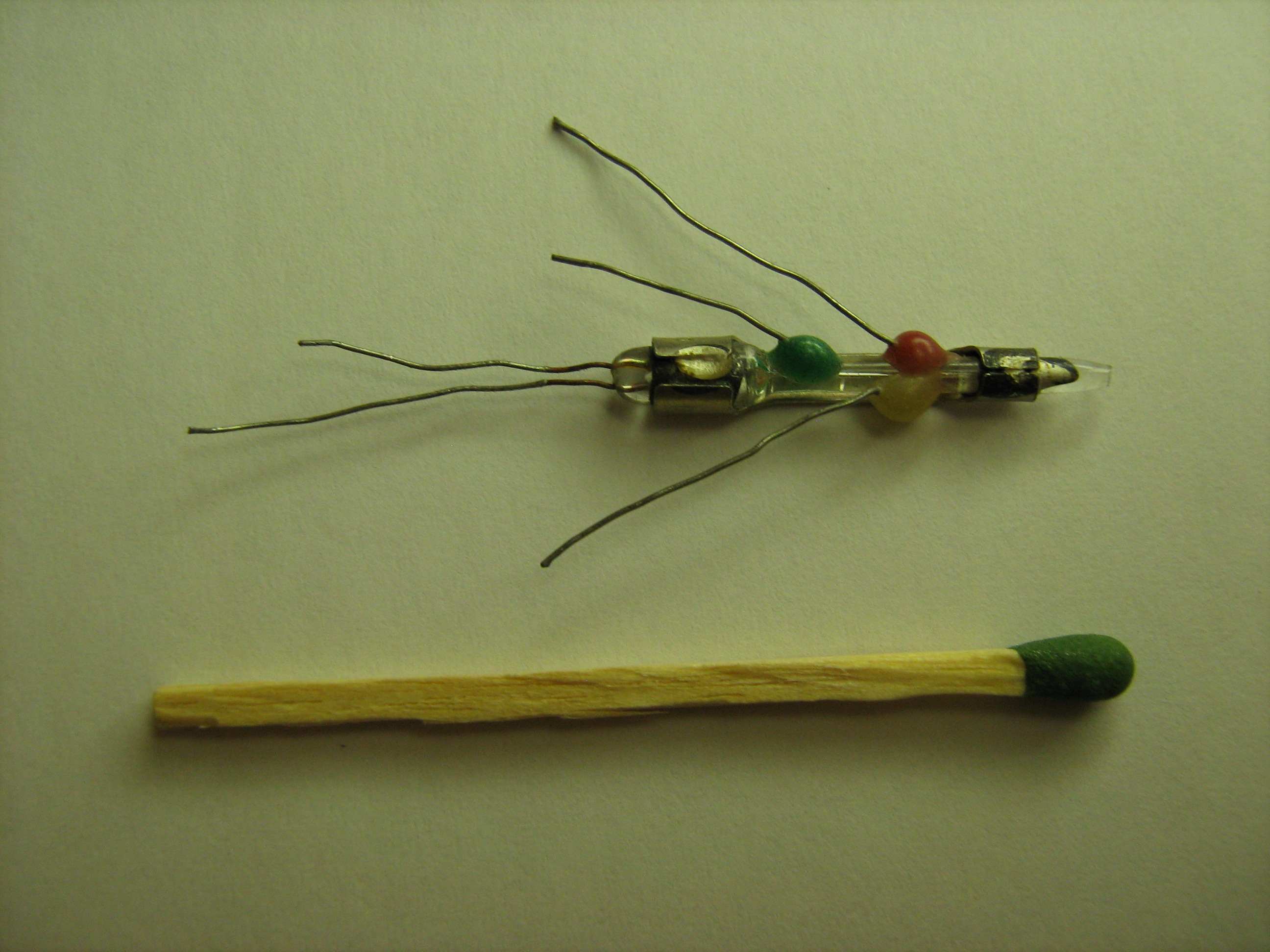 irgendwie habe ich den Verdacht, dass die drei farblich gekennzeichneten 'Elektroden' eine Position kapazitiv erkennen sollen. Die weiteren zwei Anschlüsse könnten vielleicht der Anschluss für eine Heizung sein, die Quecksilber in einem Röhrchen aufheizt, wie z.B bei einem Thermometer.