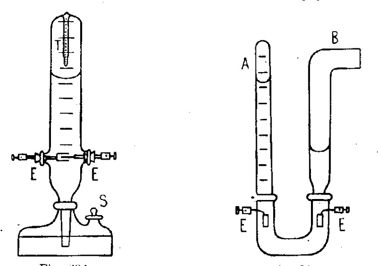 Links ist ein KNALLGASVOLTAMETER zu sehen. Oben ist ein Thermometer T das die Temperatur des Gases das bei dem Elektrolytischen Prozess entsteht misst. Vorsicht ist geboten, bei 15 cm^2 Elektrodenoberfläche kann ein Strom von 40 A fließen; wird es mehr kann das Elektrolyt dort verdampfen und es kann zur Knallgasexplosion kommen. Rechts ein WASSERSTOFFVOLTAMETER. Im Prinzip wird hier die Menge des Wasserstoffs im Schenkel bei A der bei einer bestimmten Zeit ensteht als Masstab genommen. Am offenen Schenkel B entweicht der Sauerstoff.