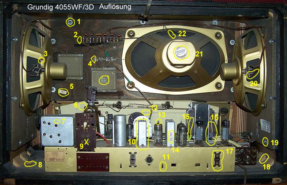 1. Schraube Schallwand oben links (von hinten) ist versetzt 2. zusätzliche Lötöse links an Lautsprecherverdrahtung 3. Hauptlautsprecher 3 Lötösen 4. Hauptlautsprecher 3 Drähte 5. linker Lautsprecher 1 Lötöse fehlt 6. linker Lautsprecher 1 Draht fehlt 7. linker Lautsprecher Schallwand zusätzliche Schraube unten rechts 8. Hauptlautsprecher Aufdruck ist verdreht 9. Schallwand Aufdruck fehlt Ziffer 1 10.Schallwand unten links (von hinten) Aufkleber fehlt 11.zusätzliche Seilrolle links (von hinten) 12.UKW-Tuner zusätzliches Loch oben mitte 13.Antenneneingang dritte AM-Buchse hinzugefügt 14.Chassis senkrechtes Stanzloch in der Mitte hinzugefügt 15.Zweite Lautsprecherbuchse hinzugefügt 16.Zusätzliches Bandfilter eingefügt 17.Beschriftung fehlt auf rechtem Bandfilter 18.zusätzliche Röhre in Endstufe 19.zusätzliche Röhrenfassung zu 18 20.Farbpunkt an rechtem Lautsprecher wegretuschiert 21.Retusche Gehäuseboden unten links (von hinten), Loch oder Dreck? 22.Klebeklotz Gehäuse unten rechts (von hinten) gefälscht 23.Beschriftung auf Höchtöner wegretuschiert