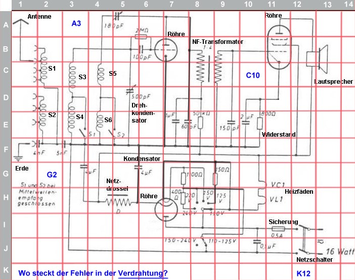Die Aufgabe lautet: Das Feld auf dem Schaltplan anzugeben, in dem der Fehler auftritt. Also z.B. A1 oder K14. Alternativ kann der Fehler auch rein textlich beschrieben werden.