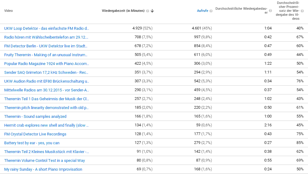 Beide meiner General-Themen (Radio und Kameras) sind aber nicht der Renner bei youtube. Ich wundere mich immer weider, welche meiner 72 Video mehr Zugriffe bekommen und welche wenig. Ich durchschaue das nicht, so manches Video verpufft einfach im Zugriff-Nirwana