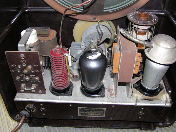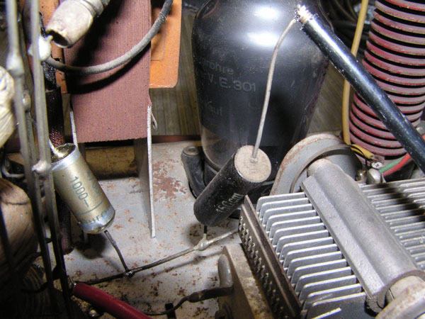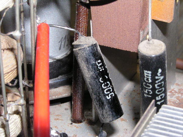 Nachdem soweit alles wieder eingebaut war und noch zwei C's ersetzt wurden, habe ich zur Sicherheit die Röhren gezogen und mit der linken Hand in der Tasche mal eingeschaltet und dabei die Stromaufnahme sowie die Anodenspannung " im Auge " gehabt.....war soweit alles ok. Danach noch die Sockelkontakte mit einem Glasfaser Stift gereinigt, Röhren hinein und mit dem Regeltrafo langsam hochgeregelt. Dann Antennen quer durchs Zimmer gespannt, Erde bis in die Zimmer Ecke gelegt und dann.....quiiitsch....quuuuitsch beim abstimmen auf KW.....na das war ein Moment einfach schön Meiner besseren Hälfte hat es wohl nicht so zugesagt, sie hat sich gleich verzogen Ja, ich hätte nicht gedacht das ich so schnell zum Erfolg komme, aber Dank Eurer Hilfe war das kein Problem. Zwei kleine Probleme habe ich tunlichst vor dem Einschalten beseitigt. Beide C's ( Antennen / Erde ) waren sicherlich ein Sicherheitsrisiko und hätten längeren Betrieb nicht überlebt, siehe beigefügte Bilder. Der 150pF sowie der 60pF waren für ihr Alter noch ok.